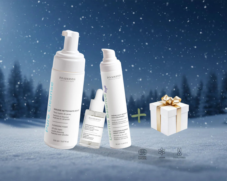 La Gelée Bioactive aux Prébiotiques hydrate et rééquilibre, tandis que la Crème Nuit aux Céramides répare et renforce la barrière cutanée face au froid et aux agressions extérieures.