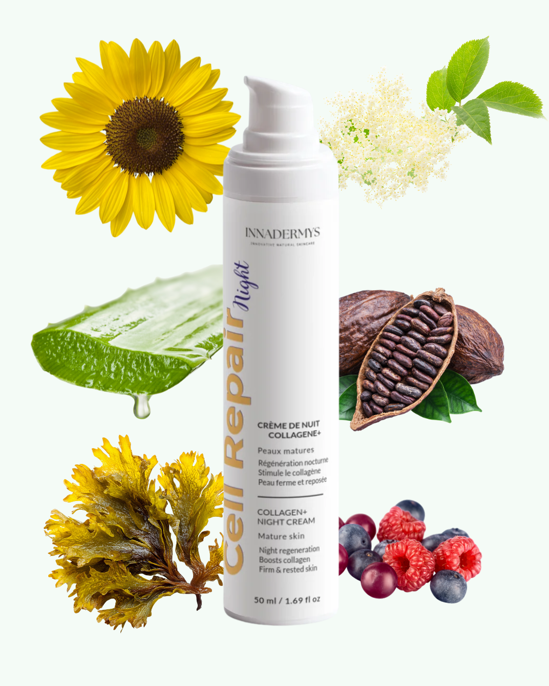 Certifiée selon le standard international COSMOS par ECOCERT Greenlife, notre Cell Repair Night - Crème de nuit Collagène+ allie science naturelle et performance anti-âge pour régénérer la peau pendant le sommeil.