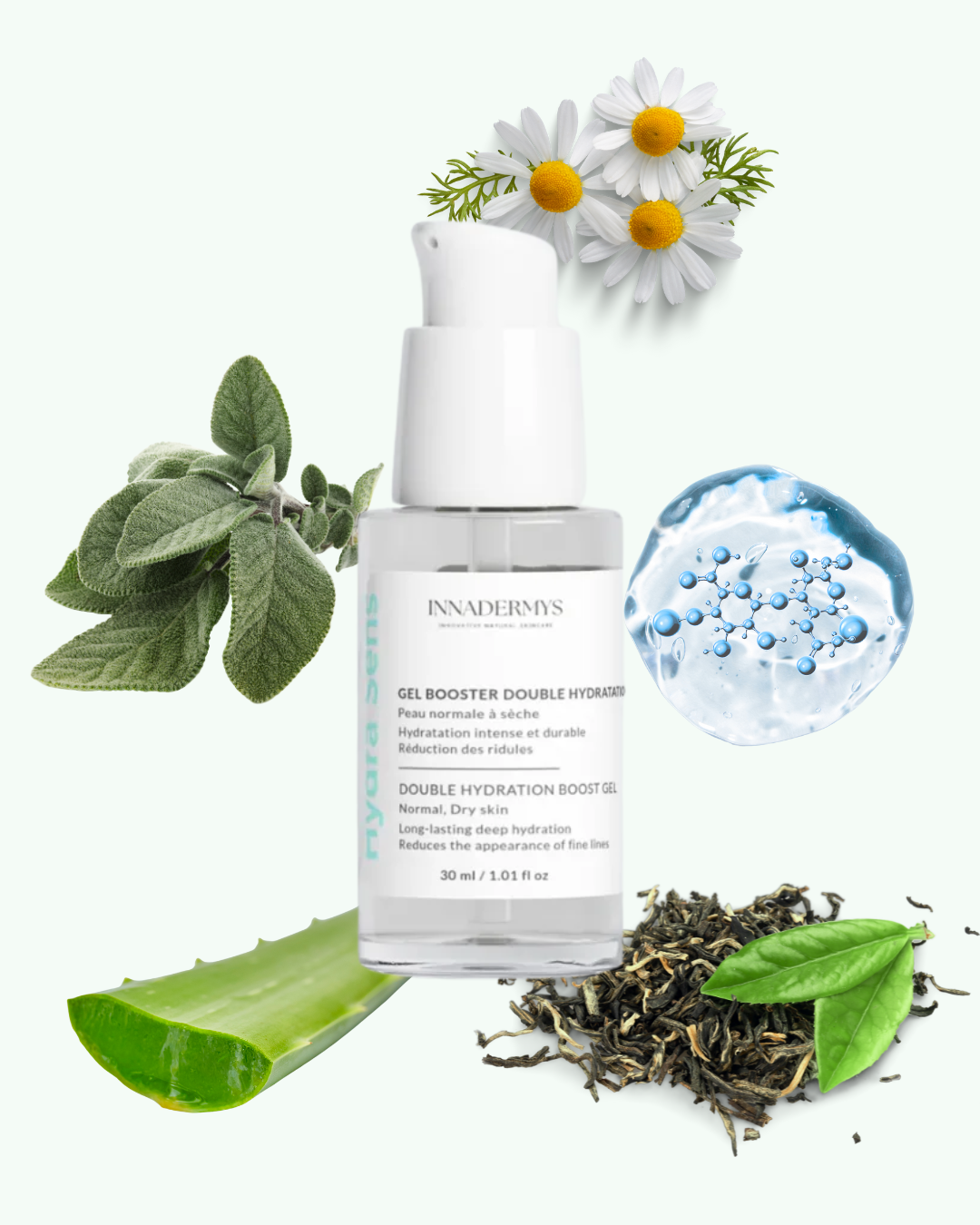 Le Gel Booster Double Hydratation est un gel léger et rafraîchissant, enrichi en acide hyaluronique multi-poids moléculaires et Sodium PCA, qui agit comme un véritable verrou d’eau pour la peau. Il préserve l’hydratation cellulaire, repulpe les tissus et améliore élasticité et tonicité, tout en réduisant visiblement l’apparence des rides et ridules fines. Les extraits de Thé Blanc et de Sauge apportent des antioxydants naturels, apaisent et protègent la peau des agressions quotidiennes.