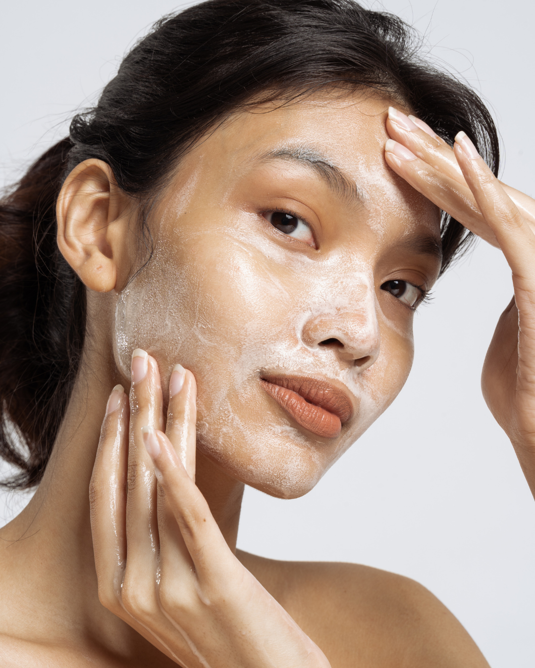 - Masser délicatement du bout des doigts pour dissoudre maquillage et impuretés.